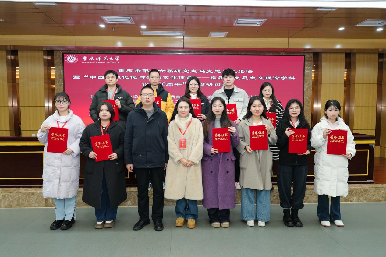 为深入学习贯彻习近平文化思想,推进中国式现代化建设事业高质量发展,值此马克思主义理论学科建立20周年之际,“重庆市第十六届研究生马克思主义论坛暨中国式现代化与新的文化使命——庆祝马克思主义理论学科建立20周年”理论研讨会于12月20日在重庆师范大学博雅楼503会议室举行。我院共有18名学生获奖,其中一等奖4人、二等奖8人、三等奖6人,成绩位居全市高校前列。学院党委副书记、院长刘富胜教授与学生工作办公室(分团委)主任、书记秦杉带领一、二等奖获奖学生代表参会。