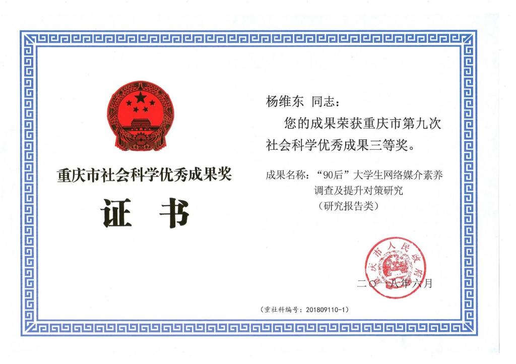 重庆市第九次社会科学优秀成果三等奖