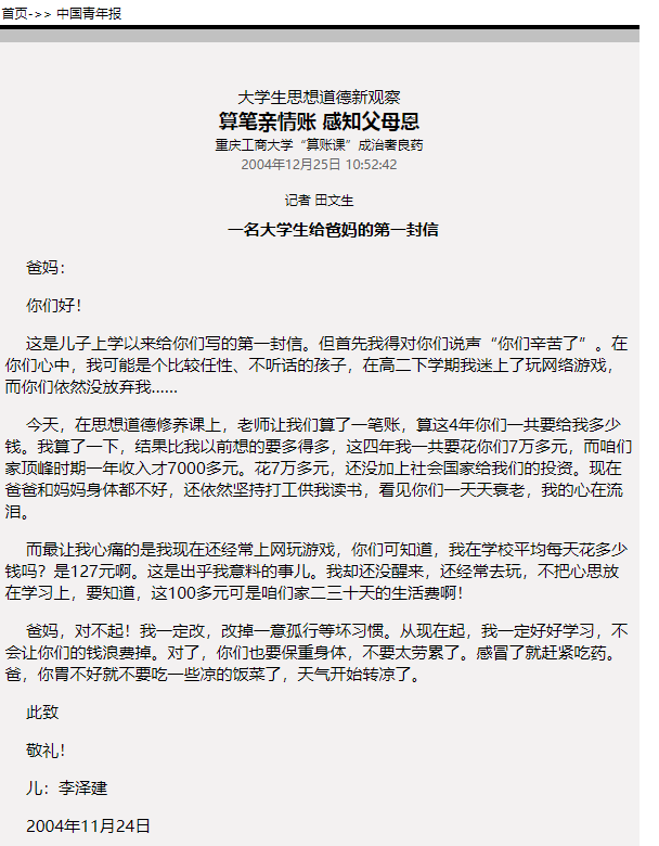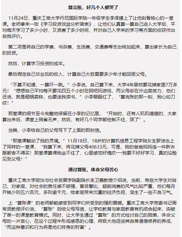 《中国青年报》“算笔亲情帐、感知父母恩”重庆工商大学算账课成治愈良药