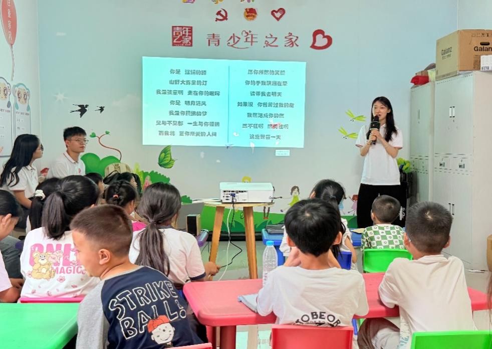 (图为团队成员颜亚蕾带领社区留守儿童学习歌曲)