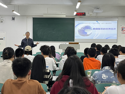 5月11日晚,学校党委常委、副校长陈运超走进2021级城管、社会工作班的“形势与政策”课堂,以“脆弱复苏的世界经济”为主题,为同学们讲授了一堂既有全局高度、又有理论深度的形势与政策课。