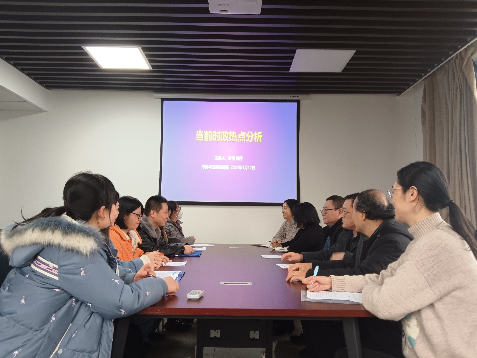 1月17日,“形势与政策”教研部在90911会议室举行了系列教研活动的第三场:当前时政热点问题分析,对未来学期课程的开展进行了谋划。会议由“形势与政策”教研部专任教师黄伟教授主持,专兼职教师十余人参加了本次会议。黄伟教授就近期国内外时政热点以及如何利用这些热点问题开展教学和加强对学生引导展开了深入的讲解。与会教师进行了热烈的讨论,纷纷表示要学习借鉴黄伟教授幽默风趣的讲课方式,并不断提升对热点时政的关注度和敏感度,加强专业素养培训,深入推进“形势与政策”一流课程建设。