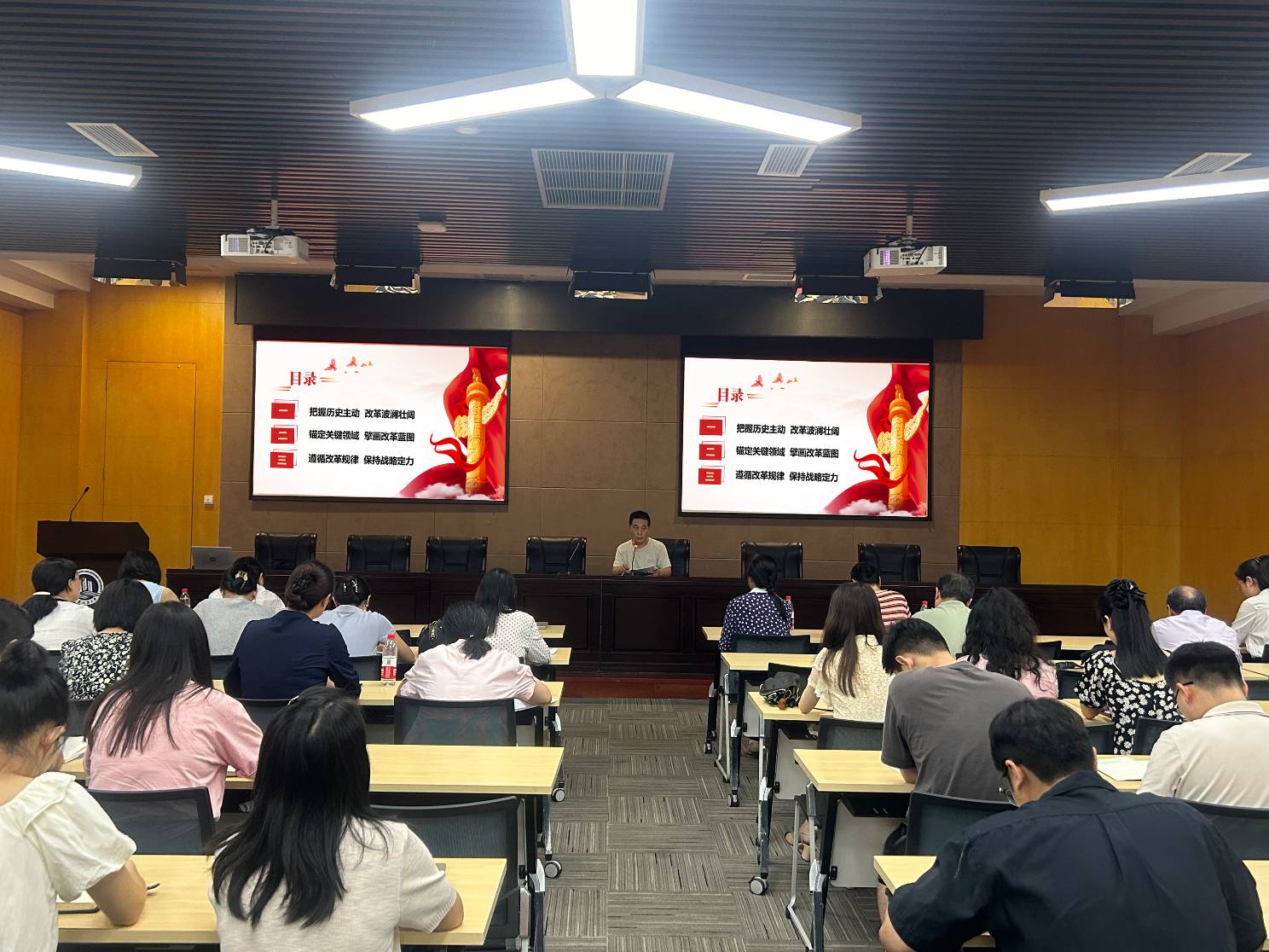 教研部专任教师何莉教授作为主讲老师对第二专题备课流程进行了讲解。本讲主题是:七十五载迎盛世 砥砺前行续华章。何莉老师结合自己在备课过程中的深刻体会与到场教师们广泛交换了意见,她认为本讲内容可以采取既定性和灵活性相结合的方法进行教学。