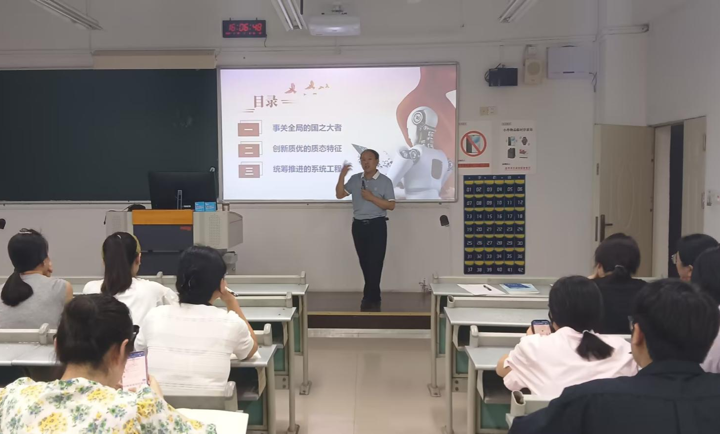 会上,黄伟教授以“加快发展新质生产力”为主题,引领全体教师深入研讨,模拟生动教学场景,将最新国家政策导向与经济社会发展特别是科技创新变化巧妙融入课程设计之中。黄伟教授指出,本专题内容紧密结合当前热点话题,从“是什么”“为什么”“怎么办”三个方向推进教学,需要讲清楚发展新质生产力的重大意义、新质生产力的本质特点和如何培育发展新质生产力。黄伟教授的主讲过程循循善诱、生动活泼,能从师生关注的热门话题、重大时事和身边热点找到有效的教学结合点,在场教师纷纷表示受益匪浅。